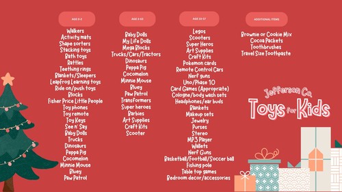 Each child will receive a gift or bundle of gifts valued at $35-$40, a stocking stuffer valued at $5-$10, selection from the "freebie" section, a toothbrush, cocoa mix, baking mix, and potentially other misc items that we are provided.